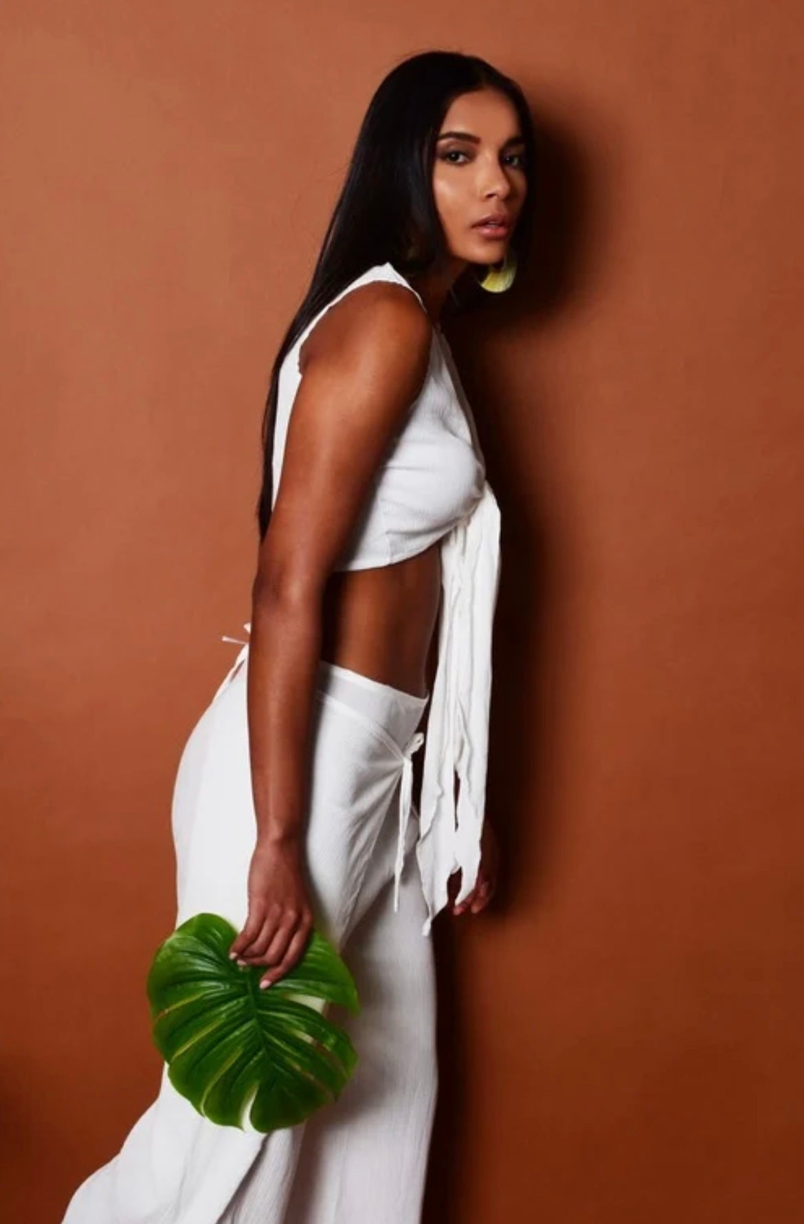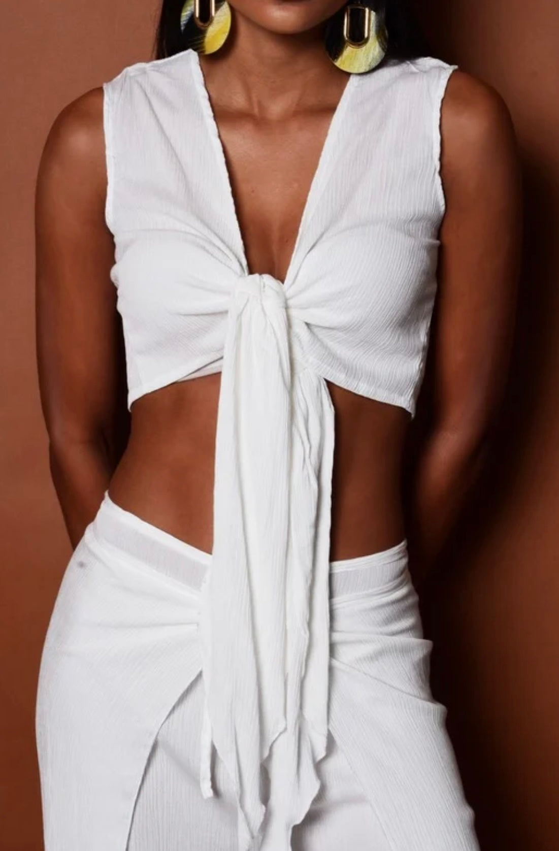Set con top de nudo y pantalón ajustable con aberturas laterales, increíble para complementar tu look de playa.